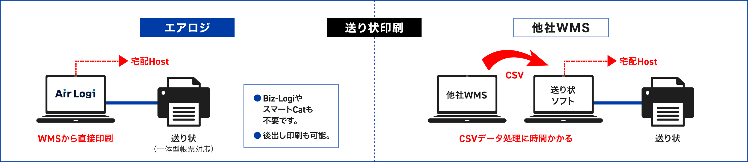 大半の競合他社ではできない機能です。エアロジなら宅配会社や後払い会社の印字システムの利用が不要です。
