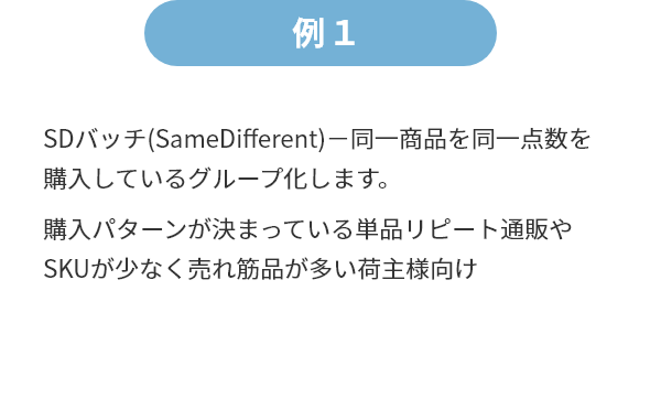 事務員の属人的作業を排除し、データ処理や帳合ミスの防止、倉庫現場の待ち時間の削減に貢献します。バッチグルーピング機能の種類は下記の構成で設定可能です。