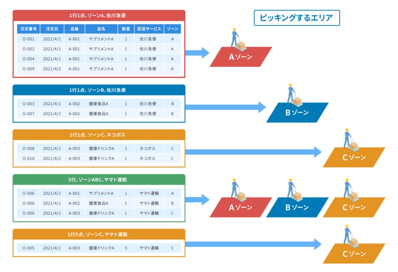 配送方法、支払い方法、ピッキングゾーンなどで分割するか設定